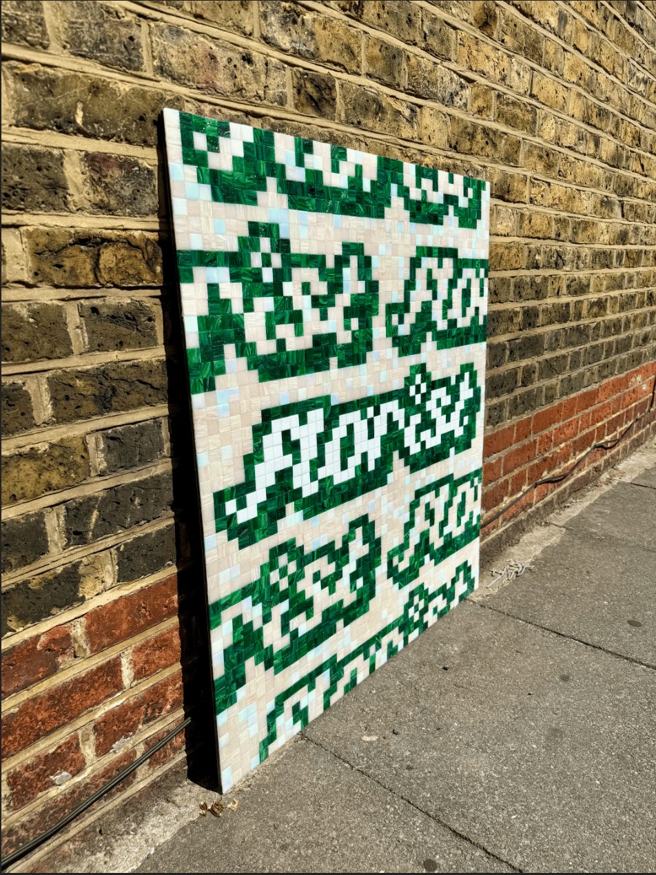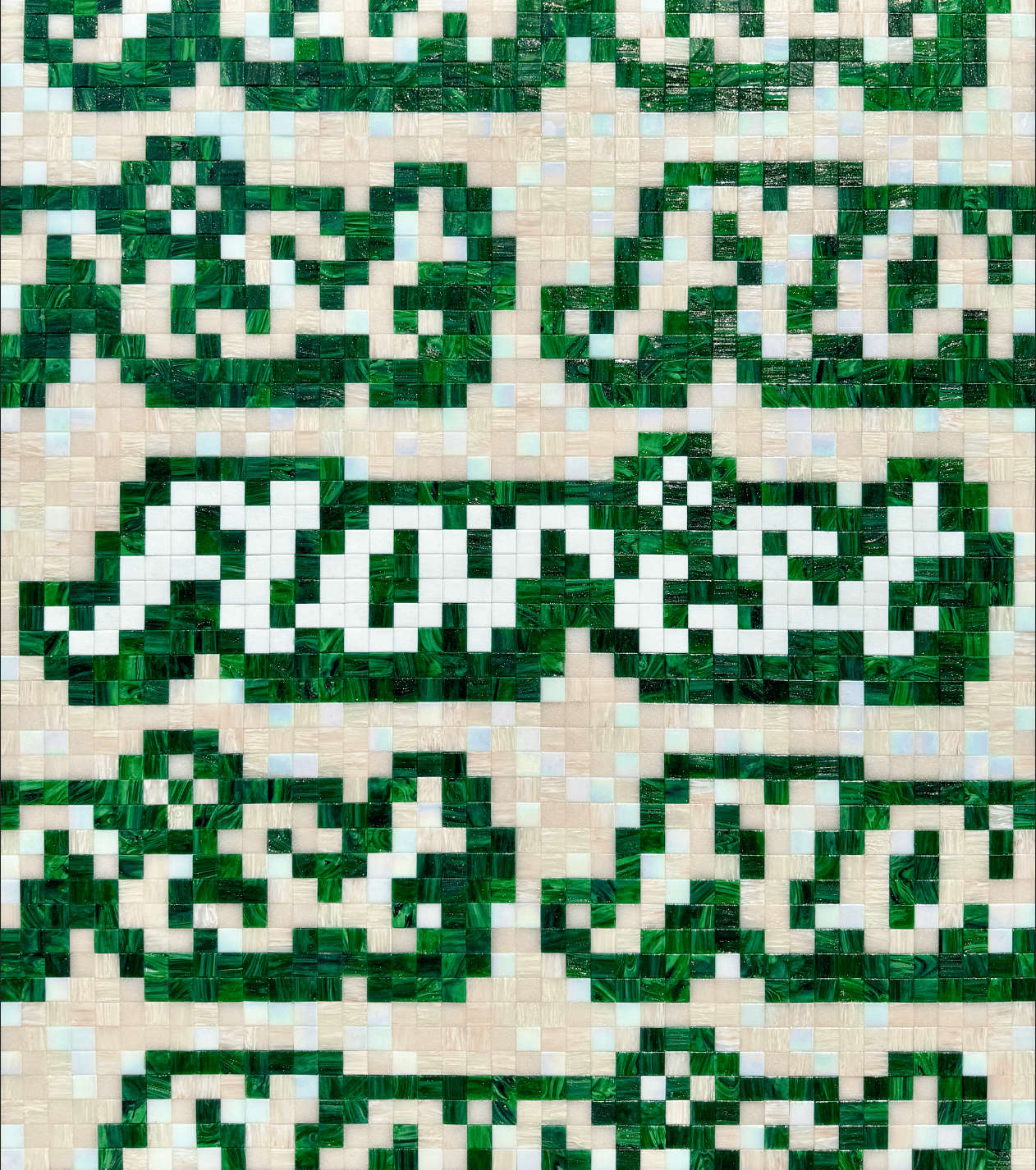 Exploring repetition and pixelated form through hand-cut glass tesserae.